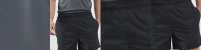 Microfibre with peached finish. Elasticated waist, drawcord, panel seams with twin stitching. Side pockets, back pockets with Velcro™ fastening and eyelet, keycord, mesh liners, twin needle hem. Also available in kids'