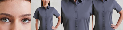 Soft collar styling. Rounded bottom hem. Fitted styling with bust darts and back darts. Easycare fabric, short sleeves. Pearlised buttons on light blue and white. Self colour buttons on remaining. Size 6, 8, 10, 12, 14, 16, 18, 20, 22, 24, 26 * size 6 only available in these colours