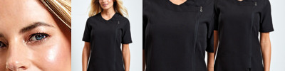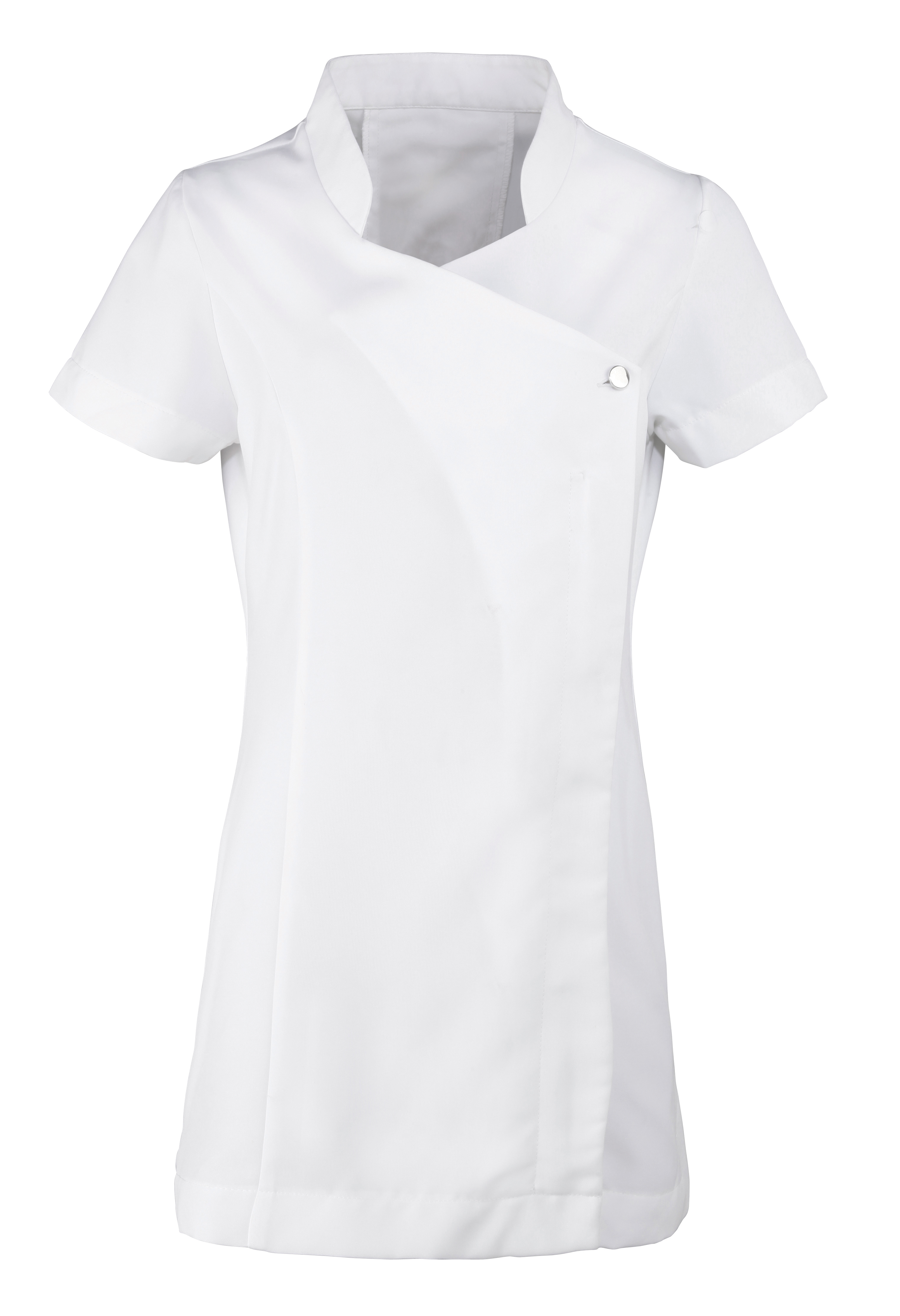 Beauty and Spa tunic with cross over neckline and asymmetric zip front. Short sleeve with vented cuff. Side vents. Princess seams with top-stitch detail for flattering fit. Easycare. Size 8, 10, 12, 14,16, 18, 20, 22, 24