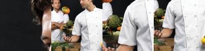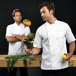 Refined chef's jacket Hand rolled cloth buttons. Double breasted. Soft hand feel. Refined stitching. Tapered placket. Short sleeved. Mandarin collar stand with top stitching.