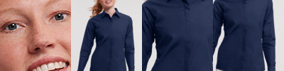75% cotton/25% elastomultiester (LYCRA®T400®). Moisture management fabric. Fitted style. Neat modern collar. Concealed placket. Princess panels, no side seams. Back darts. Cocktail cuffs. Curved hem.