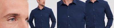 75% cotton/25% elastomultiester (LYCRA®T400®). Easy care, moisture management fabric. Fitted style. Semi-cut away collar. Narrow placket. Plain yoke. Square edged two button adjustable cuffs with button on cuff gauntlet. Option for cuff links. Curved hem.