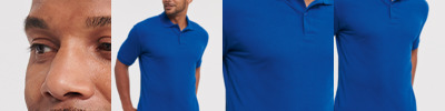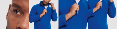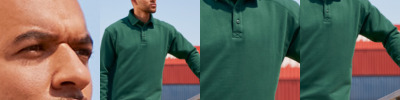 65% polyester/35% ringspun cotton. Hardwearing fabric. Ribbed collar and cuffs. Taped neck. Two self colour button placket. Reinforced shoulder seams. Twin needle stitching.
