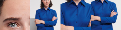 70% cotton/30% polyester. Easy care fabric. Tailored fit. Classic collar. Bust and back darts. Two button adjustable cuffs. Curved hem. Available in short sleeve 933F.