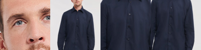 65% polyester/35% cotton. Easy care fabric. Semi-cut away boned collar. Double folded seams. Plain back yoke. Adjustable cuffs with button on cuff gauntlet. Option for cuff links. Curved hem.