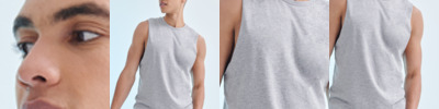 60% cotton/40% polyester.* Single jersey. Self fabric bound neckline and armholes. Racer back style. Side seams. Longer length. Twin needle straight hem. Tear out label.