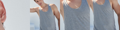 Single jersey. Ribbed collar. Raw edged armholes and hem. Tear out label.