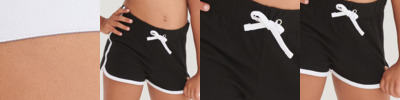 100% cotton. Single jersey. Elasticated waistband with contrast mock drawcord. Contrast white binding, black/black is self colour. Tear out label.