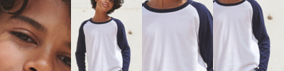 100% cotton.* Single jersey. Contrast ribbed collar. Taped back neck. Contrast raglan sleeves. Longer length. Twin needle curved hem. Tear out label.