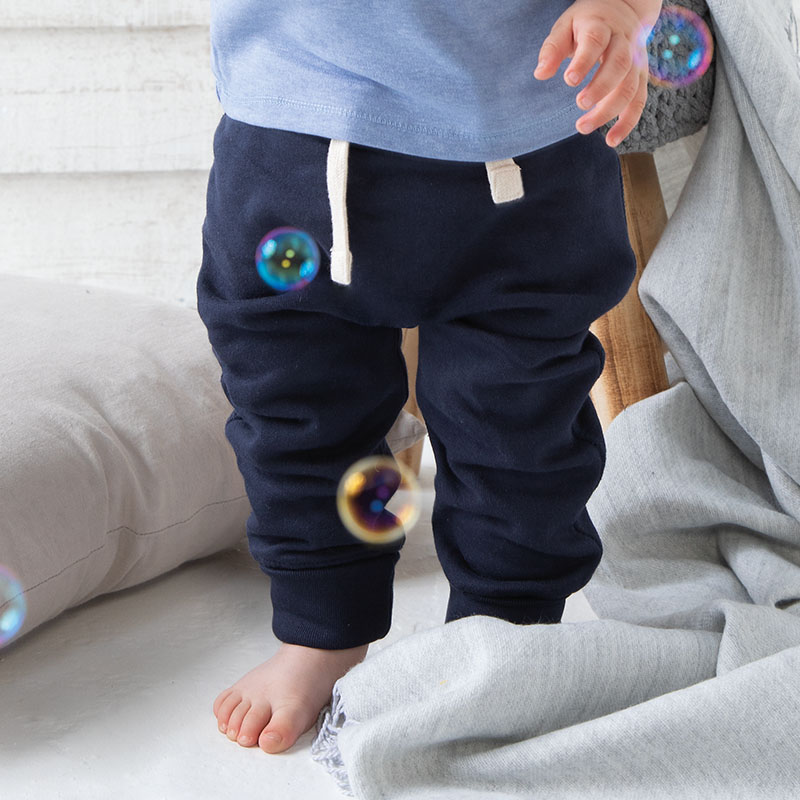 Looser fit, soft and cosy baby sweatpants with mock drawcord detail at waist. Extra long cuffs can be worn folded or unfolded as baby grows. Centre-seam free for optimum decoration potential.