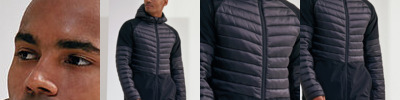Hybrid jacket with diagonal quilted upper chest and back. Lower jacket is shell fabric. Full zip-through style with panelled hood. Hood is elasticated for a snug fit. Front pockets. Quilted detailing to arms with lower arm in shell fabric. Internal storm flap with zip guard. We recommend using block out vinyl and inks.Product contains no branded neck or waist label. Removable Kimble or looped garment tags. Inner seam label holds important product information on one label with a second label containing brand information which can be cut-away.