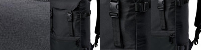 100% recycled 900D polyester/100% recycled 1680D polyester. Padded adjustable shoulder straps. Main compartment with roll-top closure. Rear padded laptop compartment, compatible up to 16". Front slip pocket with magnetic closure. Side pockets. Front zip pocket. PU zip pulls. Rear luggage strap. Tear out label. Capacity 22 litres.